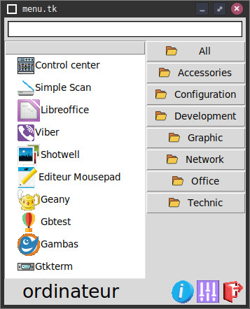 Lors d'un clic sur le bouton du menu, j'exécute simplement le script menu.tk. Voici le résultat :