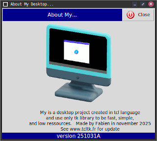 MY est un lot d'applications en TK pour remplacer les applications usuelles de nos nouvelles distributions linux qui contiennent, je le regrette, trop de dépendances à d'autres bibliothèques externes et qui allourdissent considérablement l'application qui doit normalement réaliser une tâche très simple à la base. ( décompresser, éditer un texte, etc...).